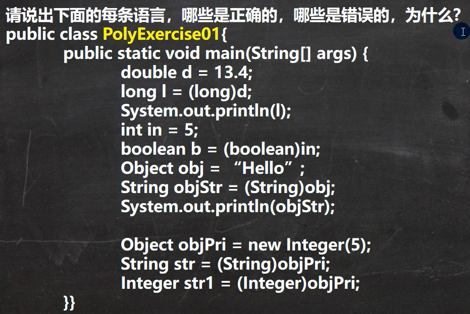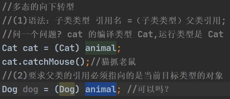 - 父类的引用必须指向当前目标类型的对象(猫不能转为狗)