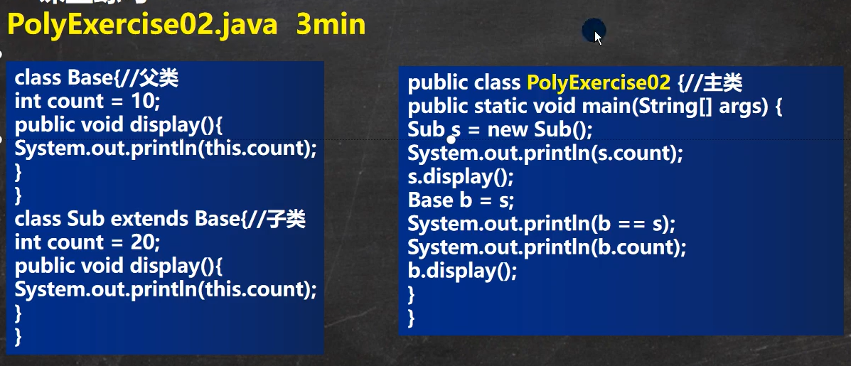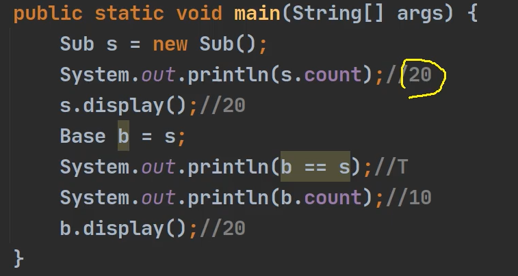 - 方法的调用,看运行类型(b.display(),this.count,任然看的运行类型的count,这里的this.count != b.count)