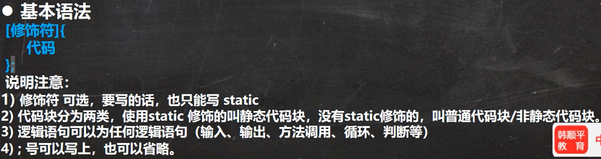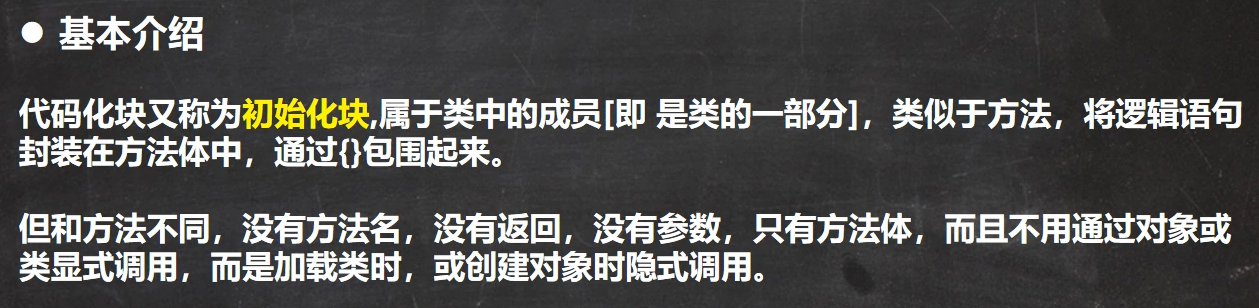 - 普通代码块,在创建对象实例时,会被隐式的调用,被创建一次,就会调用一次;如果只是使用类的静态成员时,普通代码块并不会执行