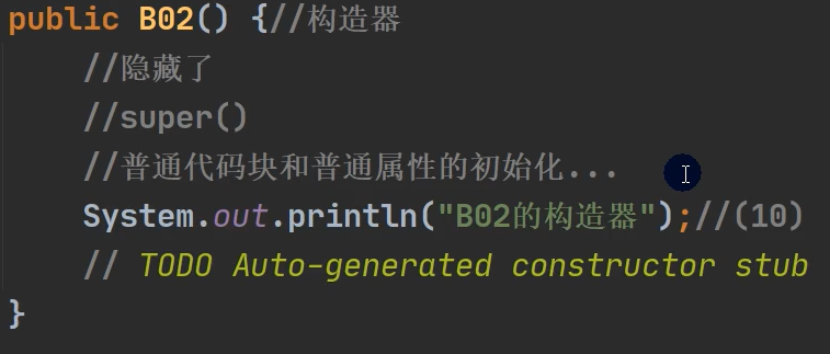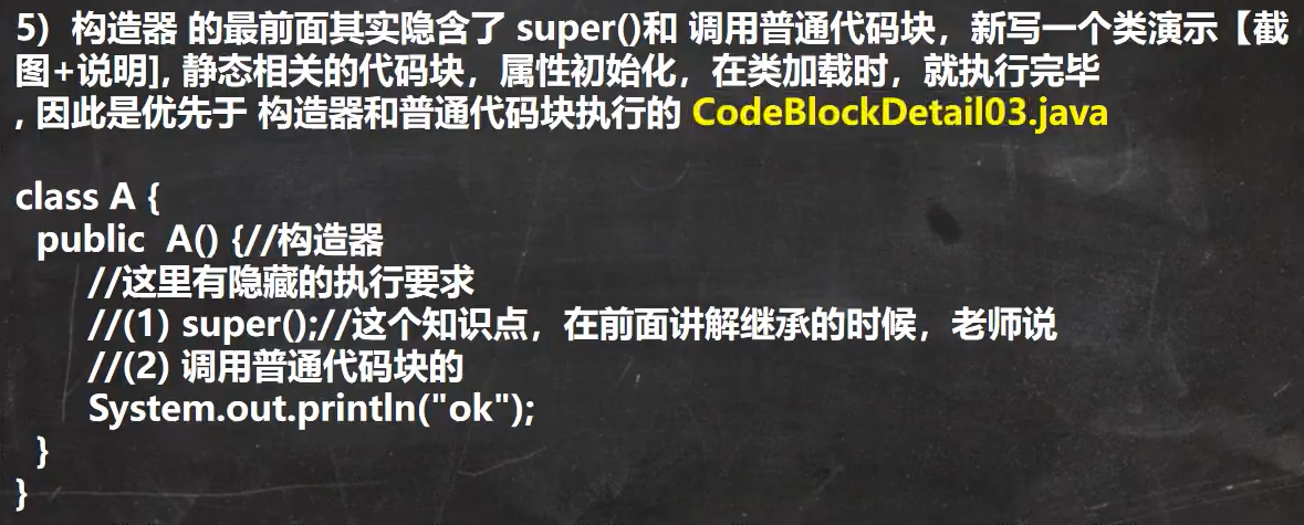 - 构造器中隐藏了super(),和普通代码块(静态代码块,属性在类加载执行)