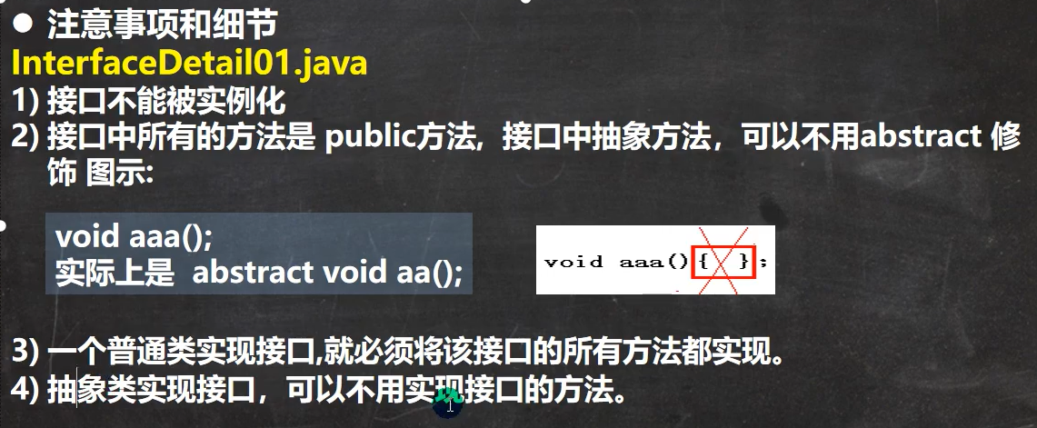 - 接口中抽象方法可以省略abstract关键字(默认)