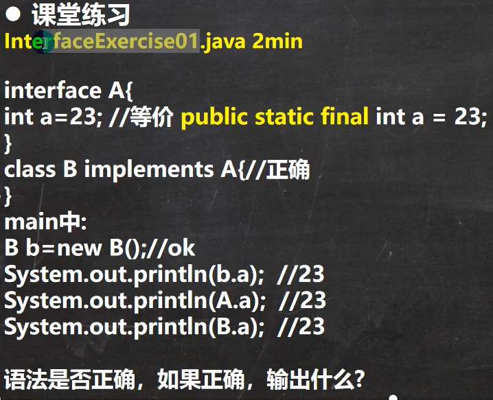 - 接口中的属性,只能是final,而且是public static final,且必须初始化
