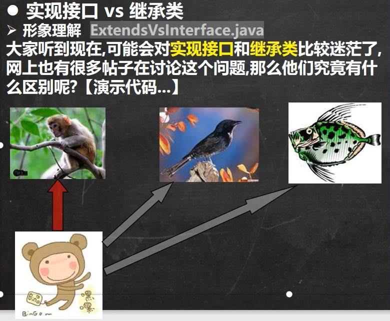 - 继承相当于一种天赋,接口是后天习得的本领