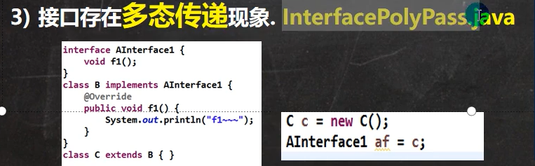 接口的多态传递:一个类实现了接口I1,I1继承的接口I2,则相当于该类实现了接口I2,且需要实现I2中的所有方法