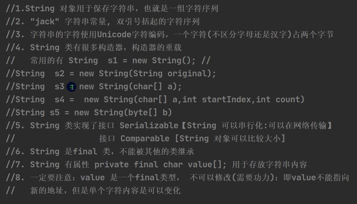 - String有属性private final char value[];用于存放字符串内容,所以String的底层是个char数组