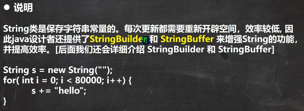 String是保存字符串常量的,每次跟新都需要重新开辟空间,效率较低
