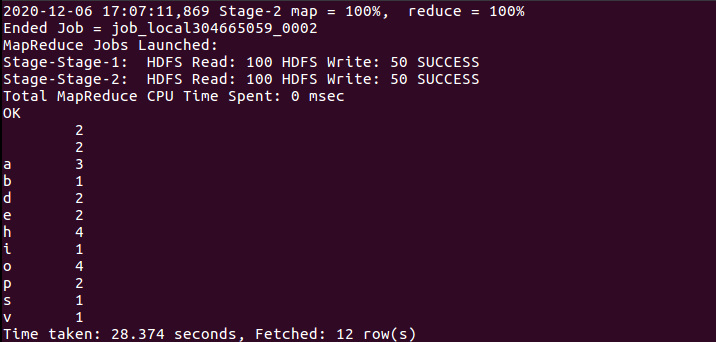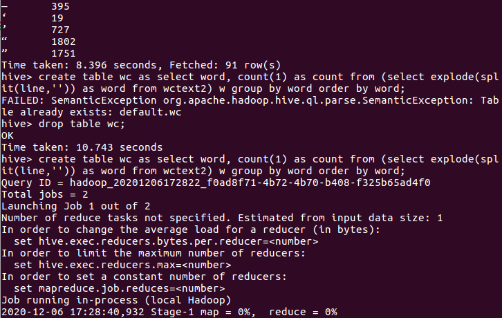 5.hql语句进行词频统计交将结果保存到结果表中。