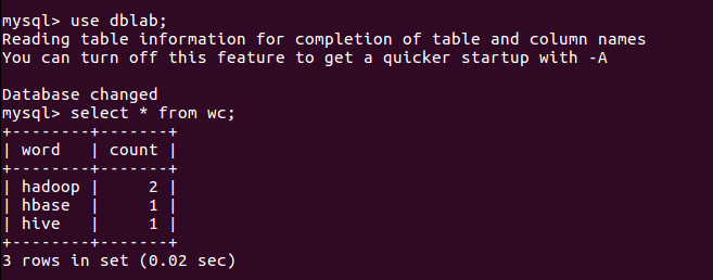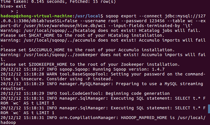 使用sqoop进行将Hive 词频统计的结果数据传输到Mysql中。