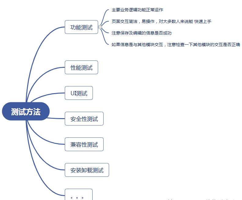 首先,测试分为功能测试、性能测试、安全性测试、兼容性测试等等,我们可以大体的列举一下,可能有的测试类型我们没接触过,但是我们要说出来,以此来表达我们有考虑到这方面的测试。