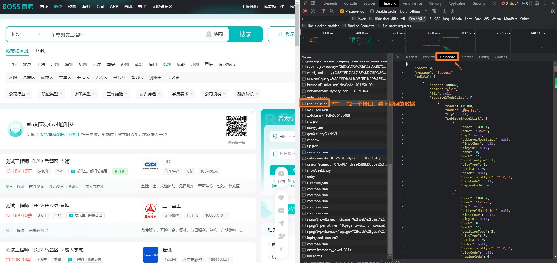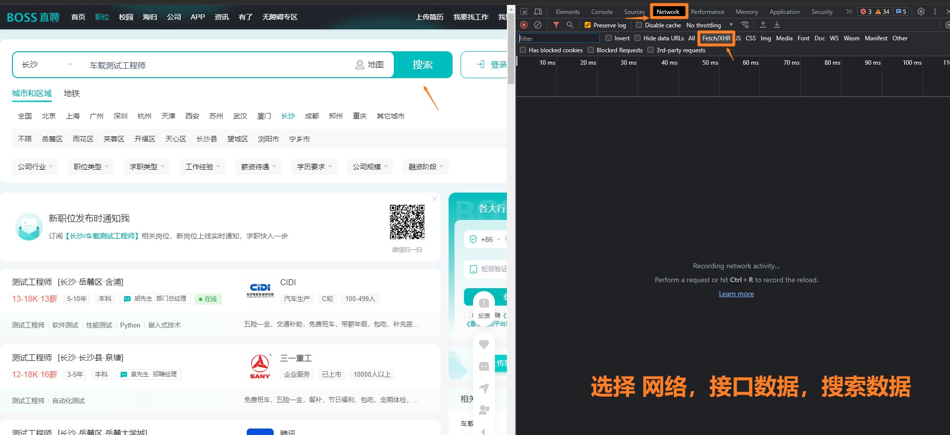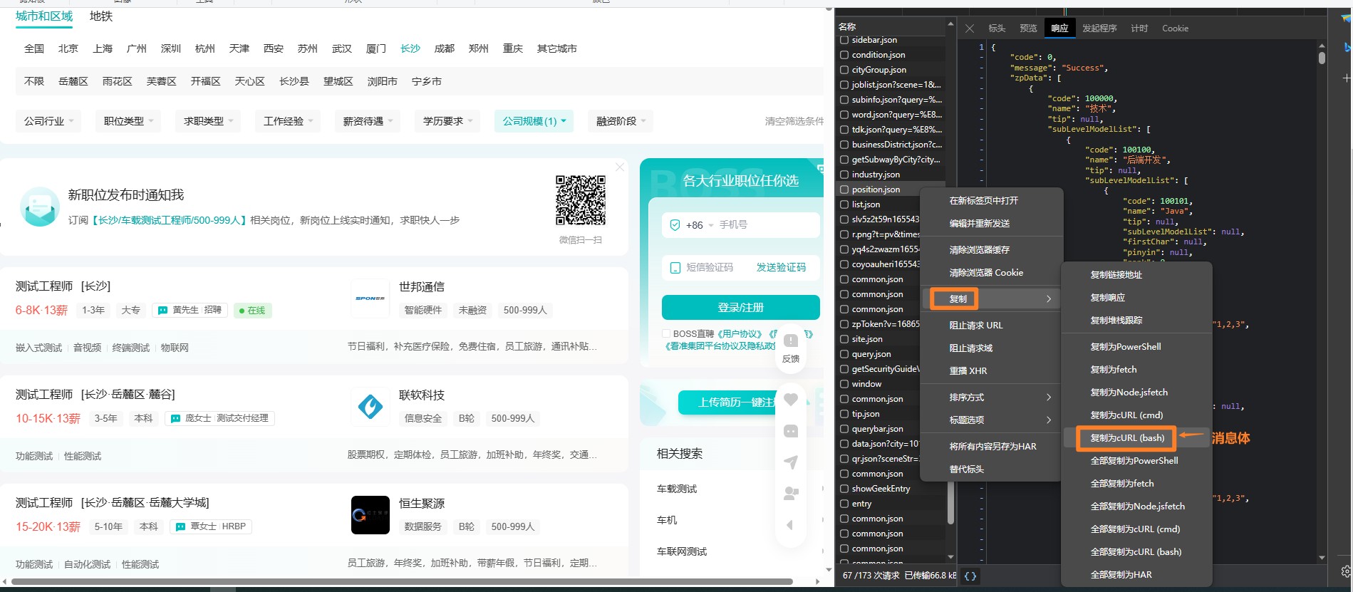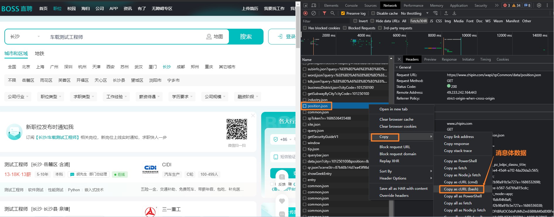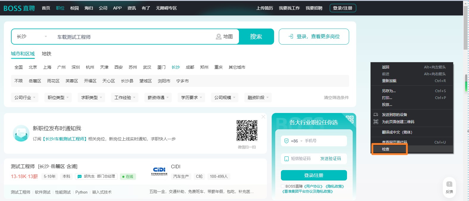 以谷歌浏览器举例:进入boos直聘网址,所以搜索职位,比如”车载测试工程师“,然后,鼠标选择空白处,右键 检查