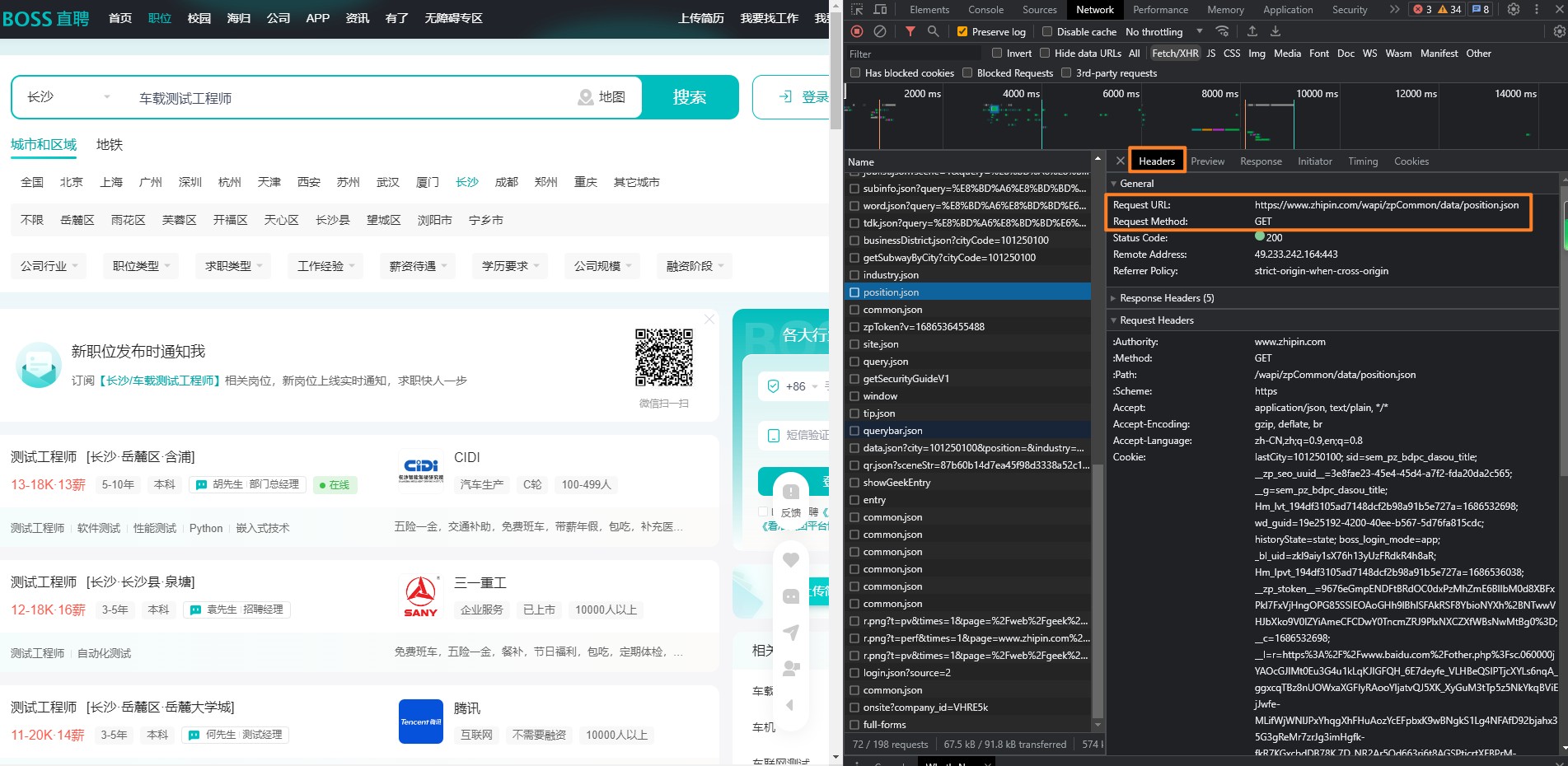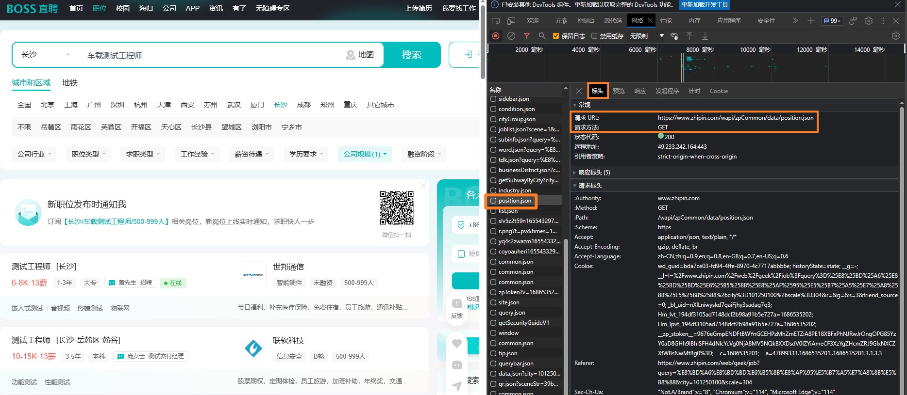 以Microsoft Edge浏览器举例:进入boos直聘网址,所以搜索职位,比如”车载测试工程师“,然后,鼠标选择空白处,右键 检查