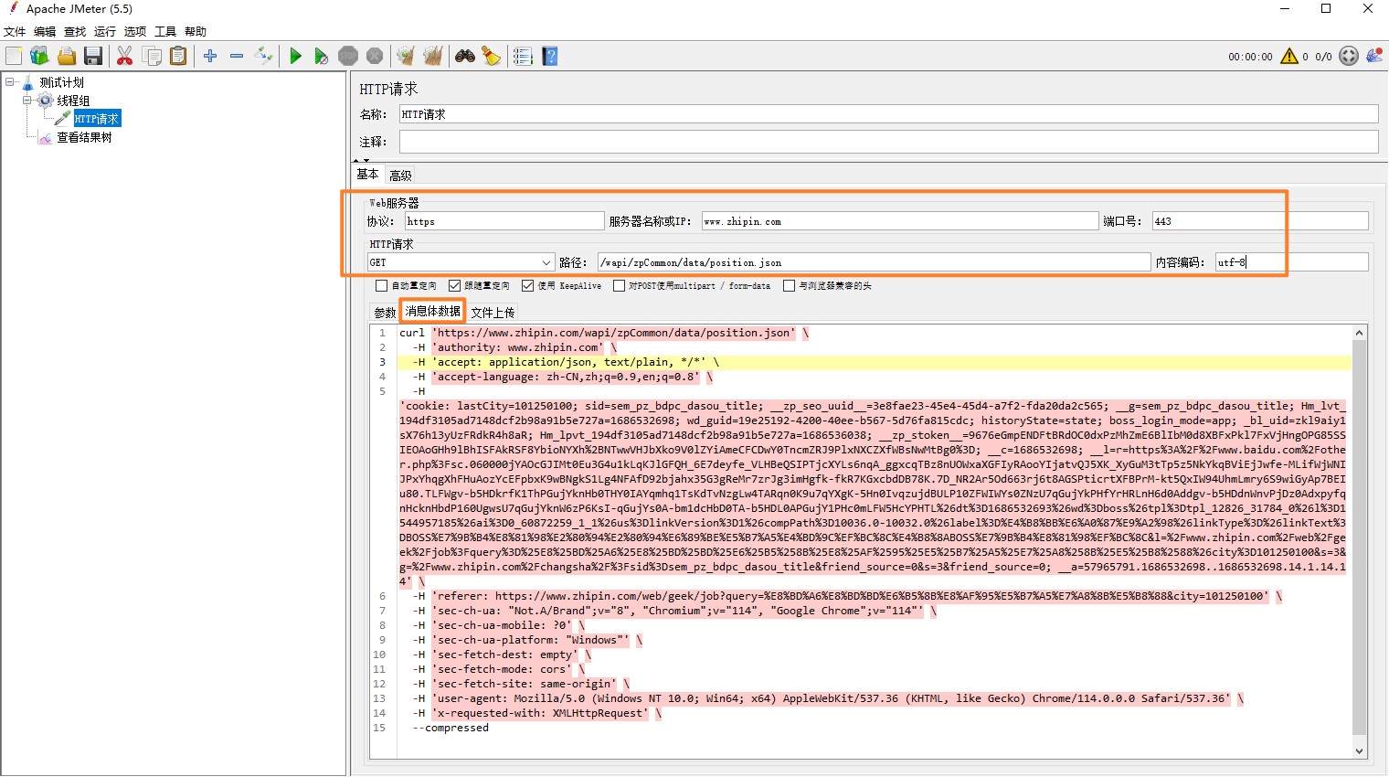 这里我们以Jmeter进入请求举例,抓取 BOSS直聘接口