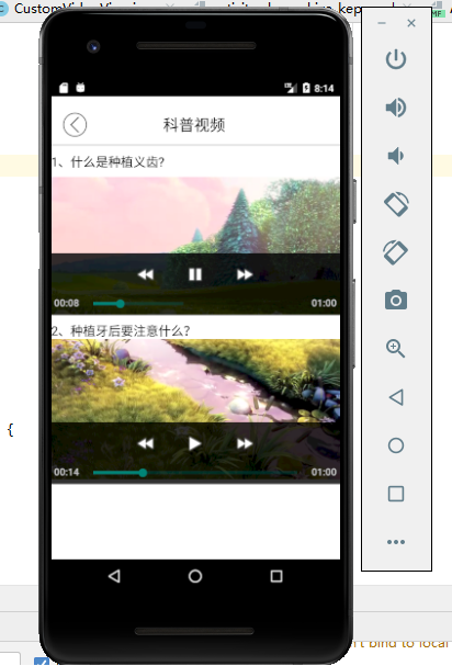 1 <?xml version="1.0" encoding="utf-8"?> 2 <LinearLayout xmlns:android="http://schemas.android.com/apk/res/android" 3 android:layout_width="match_parent" 4 android:layout_height="match_parent" 5 xmlns:tools="http://schemas.android.com/tools" 6 android:orientation="vertical" 7 tools:context=".Zhongzhiya_kepu"> 8 <RelativeLayout 9 android:layout_width="match_parent" 10 android:layout_height="71dp" 11 android:background="#fff"> 12 <ImageView 13 android:layout_width="60dp" 14 android:layout_height="60dp" 15 android:src="@mipmap/fanhui" 16 android:paddingLeft="10dp" 17 android:paddingTop="20dp"> 18 </ImageView> 19 <TextView 20 android:layout_width="150dp" 21 android:layout_height="30dp" 22 android:layout_marginTop="25dp" 23 android:layout_marginLeft="160dp" 24 android:text="科普视频" 25 android:textSize="22dp" 26 android:textColor="#000000"> 27 </TextView> 28 <ImageView 29 android:layout_width="match_parent" 30 android:layout_height="2dp" 31 android:layout_marginTop="68dp" 32 android:background="#D7D7D7"> 33 </ImageView> 34 </RelativeLayout> 35 36 <LinearLayout 37 android:layout_width="match_parent" 38 android:layout_height="match_parent" 39 android:background="#ffffff" 40 android:orientation="vertical"> 41 <TextView 42 android:layout_width="match_parent" 43 android:layout_height="wrap_content" 44 android:text="***********" 45 android:textSize="18dp" 46 android:textColor="#000" 47 android:layout_marginTop="10dp" 48 > 49 </TextView> 50 51 <LinearLayout 52 android:layout_width="match_parent" 53 android:layout_height="207dp" 54 android:orientation="vertical"> 55 56 <com.example.dachuang.CustomVideoView 57 android:id="@+id/v1" 58 android:layout_width="match_parent" 59 android:layout_height="200dp" 60 android:layout_marginTop="10dp"></com.example.dachuang.CustomVideoView> 61 </LinearLayout> 62 <TextView 63 android:layout_width="match_parent" 64 android:layout_height="wrap_content" 65 android:text="********" 66 android:textSize="18dp" 67 android:textColor="#000" 68 android:layout_marginTop="10dp" 69 > 70 </TextView> 71 <LinearLayout 72 android:layout_width="match_parent" 73 android:layout_height="207dp" 74 android:orientation="vertical"> 75 <com.example.dachuang.CustomVideoView 76 android:id="@+id/v2" 77 android:layout_width="match_parent" 78 android:layout_height="200dp"></com.example.dachuang.CustomVideoView> 79 </LinearLayout> 80 81 82 </LinearLayout> 83 </LinearLayout>