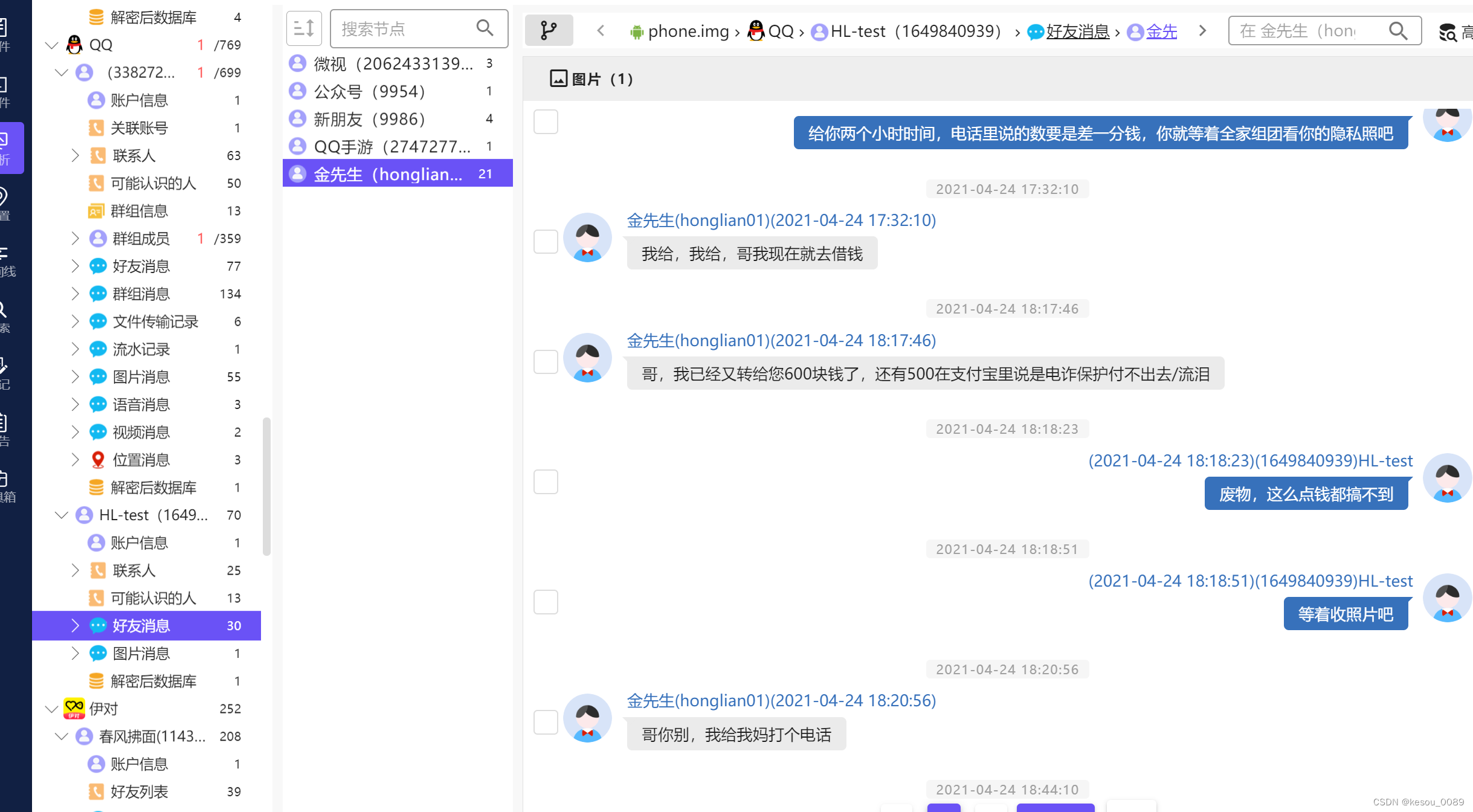 48 请分析检材四-phone,嫌疑人用于敲诈本案受害者的QQ账号为 1649840939