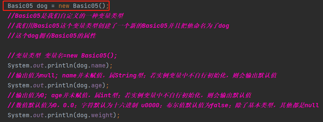 下图中我们用Basic05这个类创建了一个新的对象,名为dog,并赋予它Basic05的属性:体重、名字、年龄