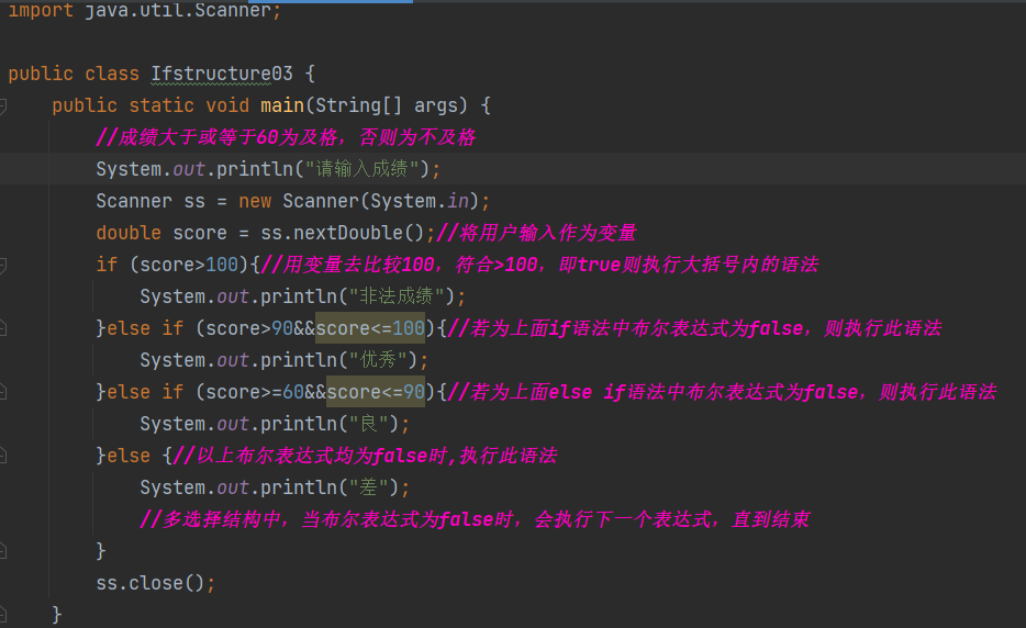 }else if(score>=60&&score<70){//第一个布尔表达式为false执行此else if