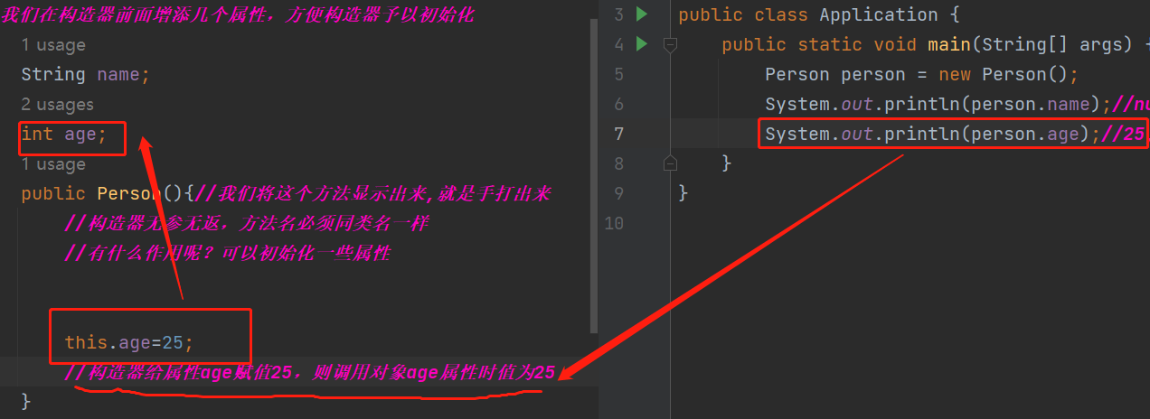 我们在创建对象的时候,也就是在用new这个关键字的时候,这个对象的类必须要有构造器;而构造器分又为有参构造和无参构造,最开始的时候默认是有一个无参构造,我们创建对象的时候那个小括号里面就不需要输入参数;还有一种构造器是有参的构造器,也就是说有参数,要传参,我们用这个构造器创建对象的时候必须要在小括号里面输入构造器形参对应的实参,也就是说你这个有参构造器定义的时候规定括号里面是什么数据类型,那么你在用的时候就写什么类型进去。