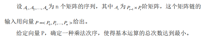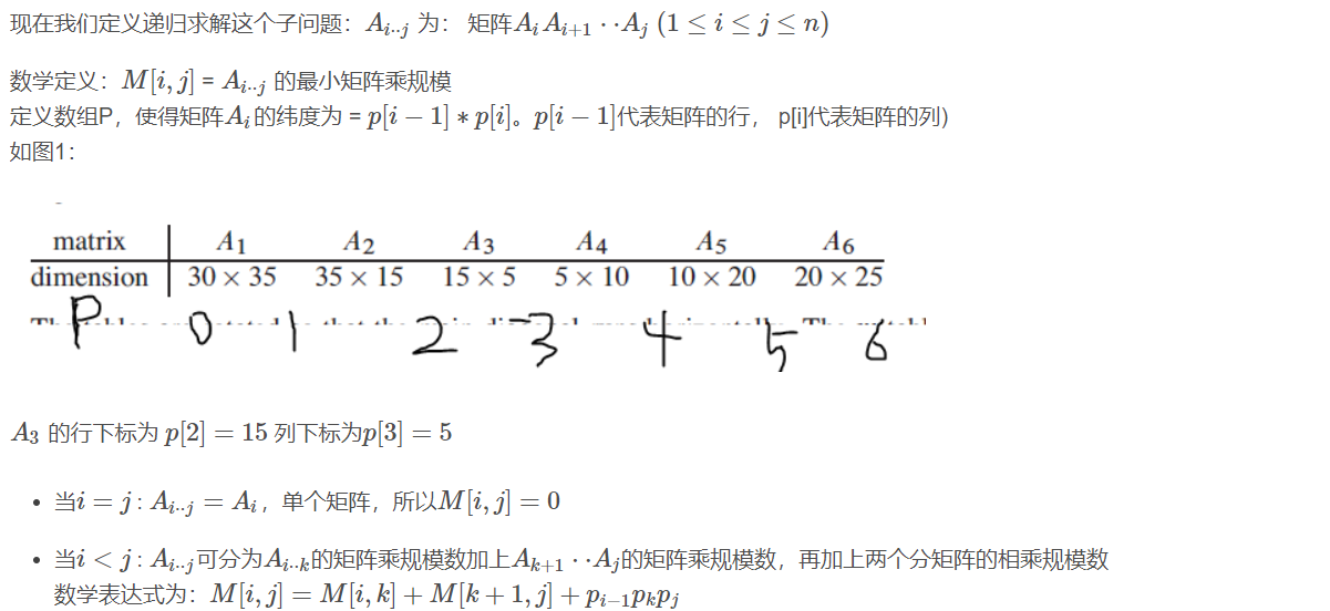 1 int n,p[N]; 2 int m[N][N], s[N][N]; 3 void MatrixChainOrder(int* p, int Length){ 4 n <- Length - 1 5 for i <- 1 to n 6 m[i][i] = 0 7 for l <- 2 to n /* 枚举矩阵链的长度 */ 8 for i <- 1 to n - l + 1 /* 枚举起点 */ 9 j <- i + l - 1 10 m[i][j] <- INT_MAX /*m[i][j]赋值为无穷大 */ 11 for k <- i to j - 1 /* 枚举分割点 */ 12 q <- m[i][k] + m[k + 1][j] + p[i - 1] * p[k] * p[j] 13 if q < m[i][j]/*如果当前值更小,修改答案,并记录下分割点 */ 14 m[i][j] <- q 15 s[i][j] <- k 16 }