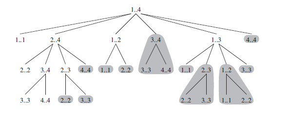 m[1,4]=min{ m[1,1]+ m[2,4]+A1(A2A3A4), m[1,2]+ m[3,4]+(A1A2)(A3A4),m[1,3]+ m[4,4]+(A1A2A3)A4};