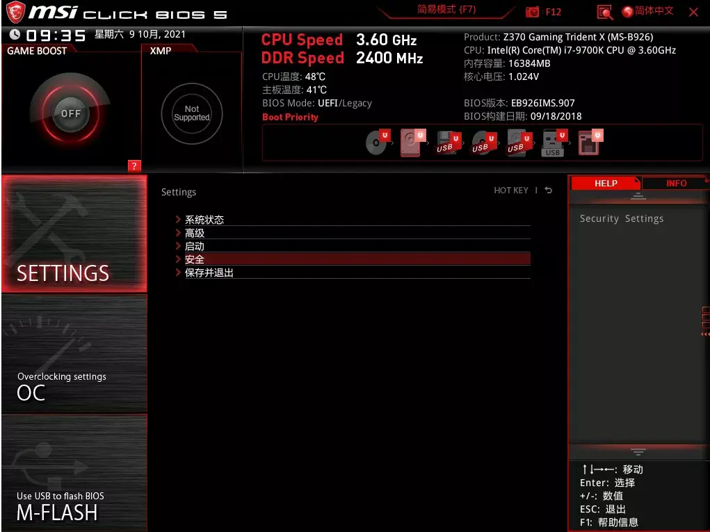 首先老规矩,开机进BIOS后按F7进入高级模式,点击SETTINGS设置界面,选择安全这一栏。