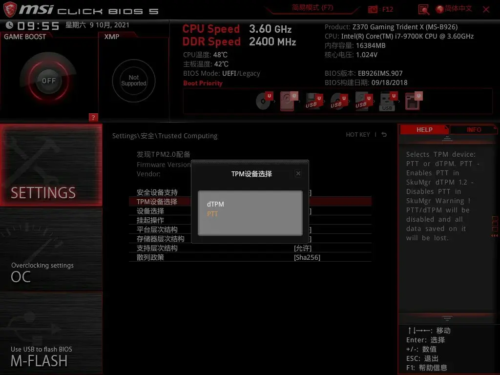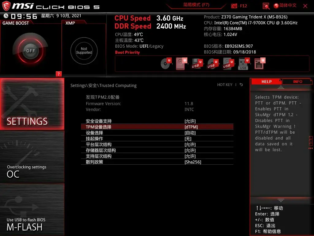 第二个TPM设备选择,从DTPM改为PTT。DTPM代表硬件级TPM模块。