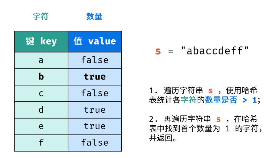 - 再遍历字符串 s,在哈希表中找到首个“数量为 1 的字符”,并返回。