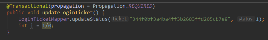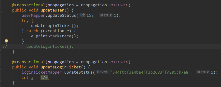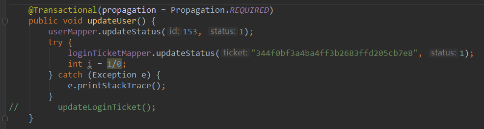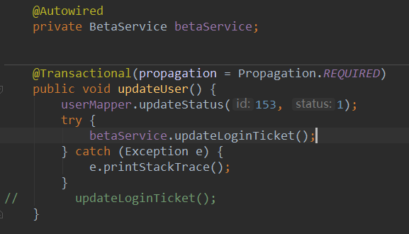 然后在测试的时候,如果不捕获异常的话,无论被调用方法的传播机制是 REQUIRED 还是 NESTED,user 和 login_ticket 中的 status 都还是为 0(回滚)。