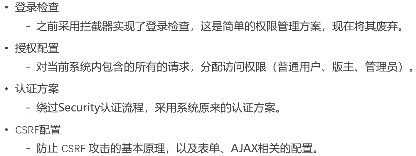 - 授权配置:每个路径能有哪些权限可以访问、拒绝访问的跳转路径
