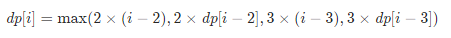 所以只需要考虑 2 × dp[i - 2] 和 3 × dp[i - 3]。至于 2 × (i - 2) 和 3 × (i - 3) 主要是确保 i 比较小的时候(如 dp[3] = 2 < 3)能够不出错。