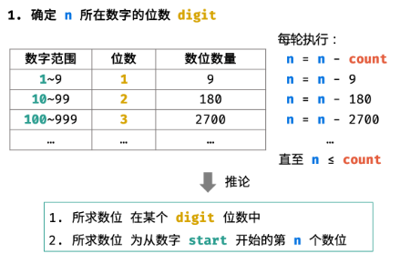 结论:所求数位 ① 在某个 digit 位数中; ② 为从数字 start 开始的第 n 个数位。
