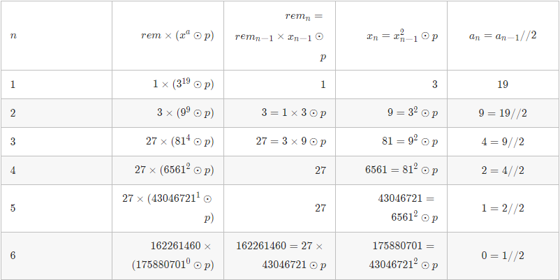 - 帮助理解:根据下表,初始状态 rem = 1, x = 3, a = 19, p = 1000000007,最后会将 rem × (xa ⊙ p) 化为 rem × (x0 ⊙ p) = rem × 1 的形式,即 rem 为余数答案。