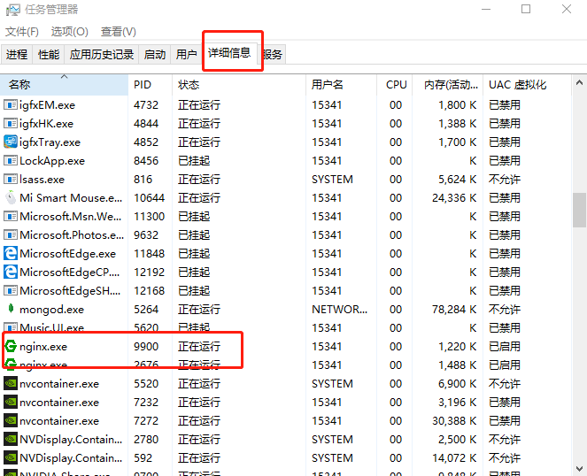 打开任务管理器在进程中看不到nginx.exe的进程(双击nginx.exe时会显示在这里),需要打开详细信息里面能看到隐藏的nginx.exe进程