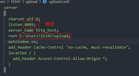 修改三:添加 C:\Users\sam\upload\upload.conf 文件,配置如下: