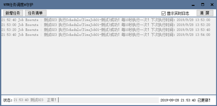 return "执行Schedule(Test01-测试)成功!每xxxx秒执行一次!下次执行时间:" + base.wfmApi.NextFireTimeUtc;//返回主界面信息