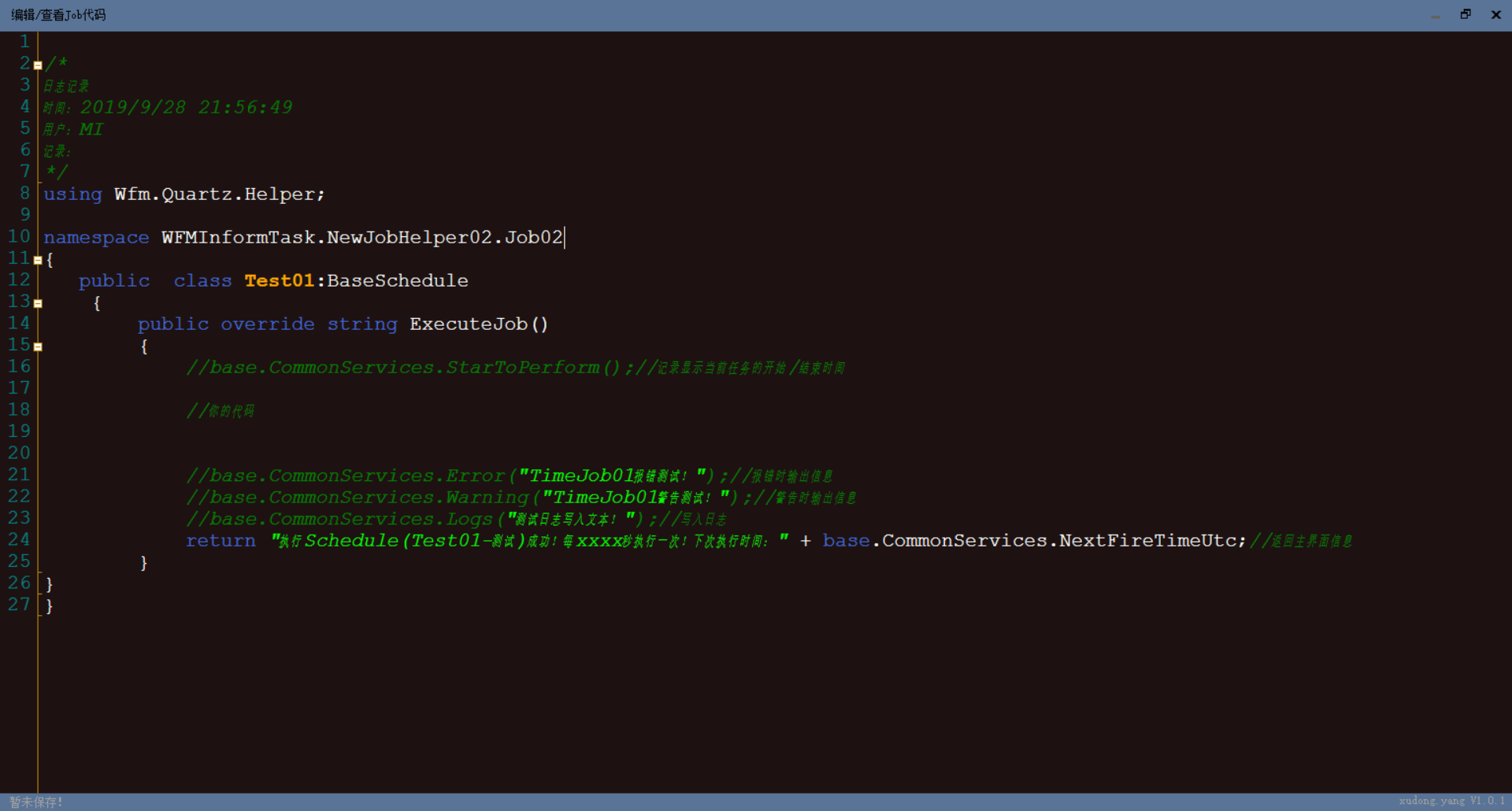 c) base.wfmApi.Warning("TimeJob01警告测试!");//警告时输出信息