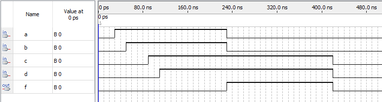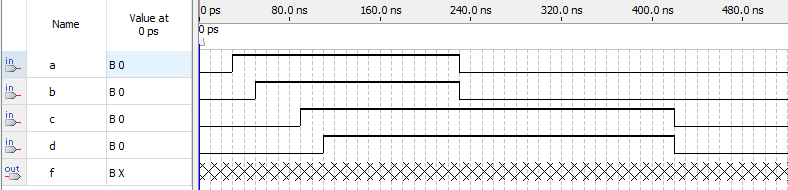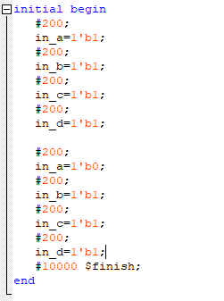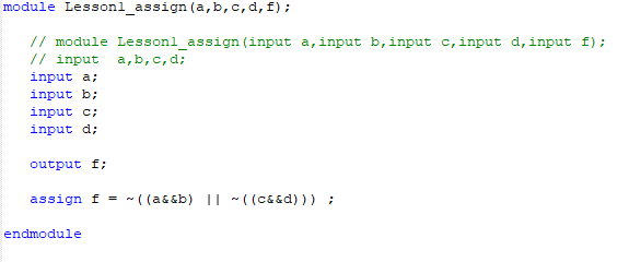 依据逻辑表达式对电路进行翻译,得到对应的程序语言,信号a,b,c,d为输入信号用关键词input定义信号方向,f为输出信号用output定义信号方向,assign用于组合逻辑表达式表述,明细代码如下