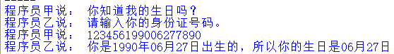print('程序员乙说:','你是' + birthday + '出生的,所以你的生日是' + birthday[5:])