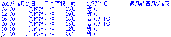 print('2018年4月17日\t天气预报:晴\t20℃~7℃\t微风转西风3~4级')