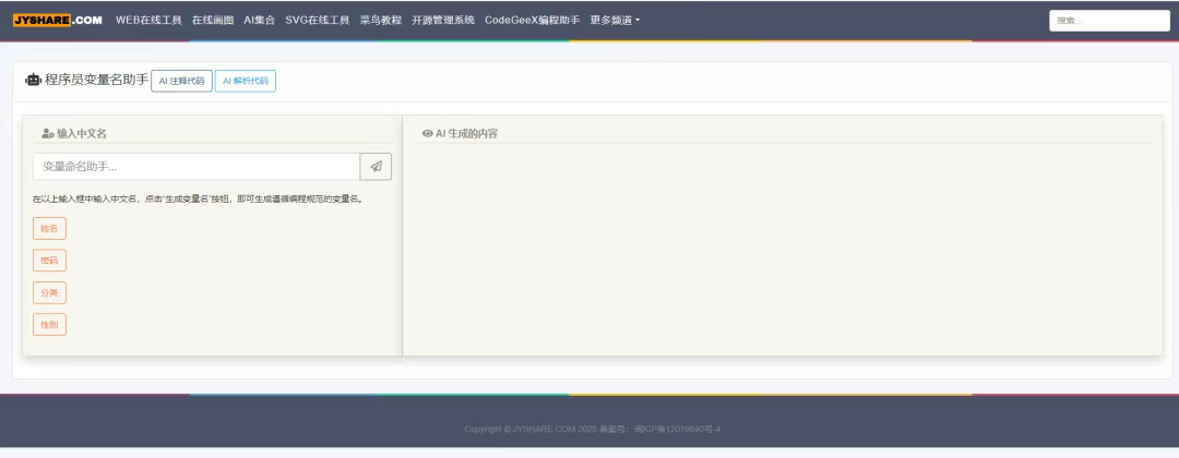 一个由菜鸟工具推出的专为开发者设计,旨在简化和优化变量命名过程。它利用先进的算法和人工智能技术,根据上下文自动生成清晰、简洁且有意义的变量名。