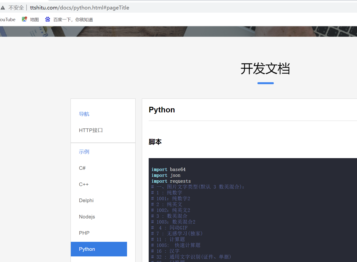 访问图鉴打码平台官网,打开开发者文档,选择Python接口,会有相应的脚本显示,直接调用并做相应的信息修改即可。