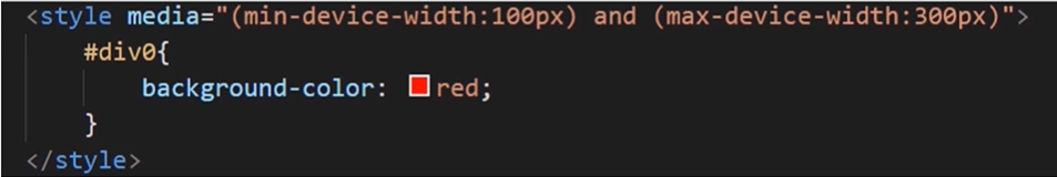 <style media="(min-device-width:400px) and (max-device-width:600px)"> div{ width:100px; height:100px; } </style>