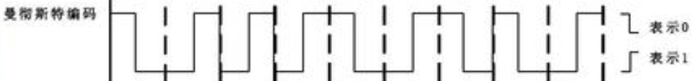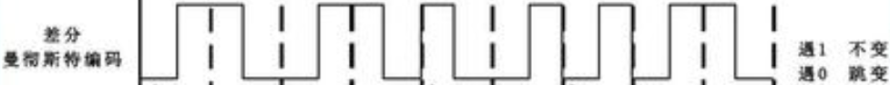 仍然在两次采样间跳变表示但仅表示时钟信号,在采样处(虚线)是否跳变表示01。