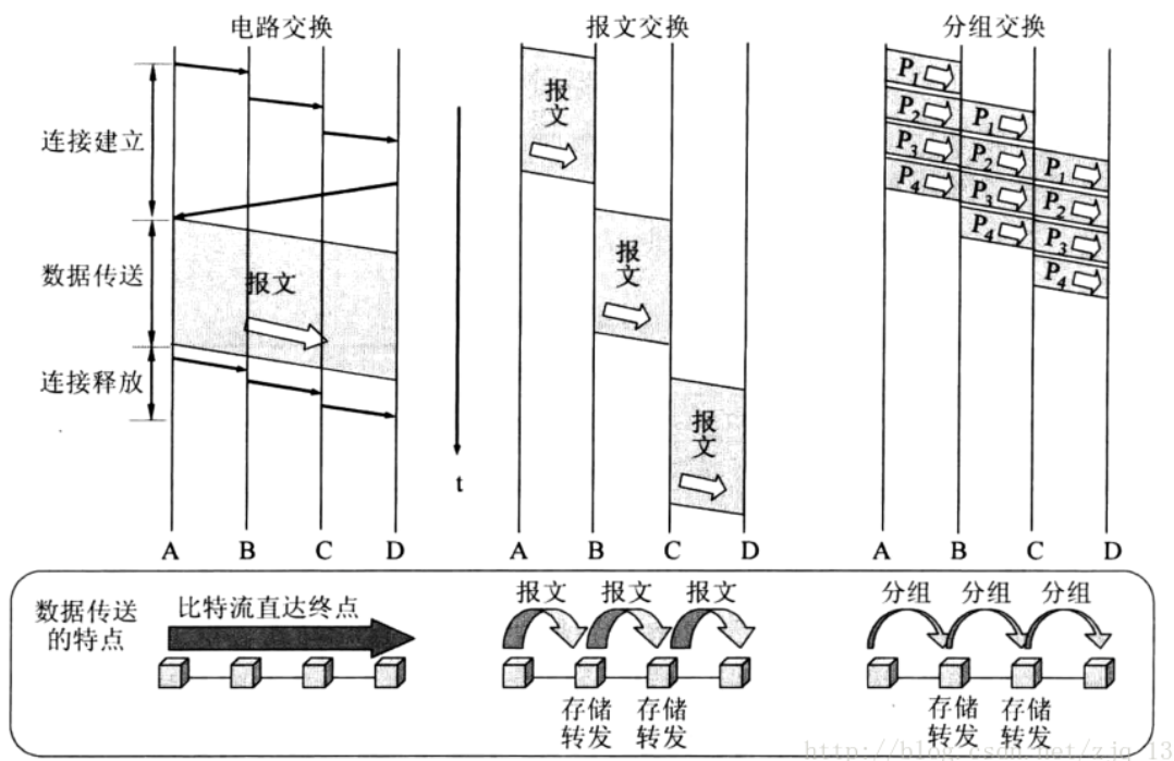 1.电路交换:电路交换就是首先在发送报文之前先建立一条连接,连接建立好之后开始发送数据,待数据发送完毕之后开始释放连接,是一种面向连接的交换方式,缺点是占用了一条线路,若始终占用这条线路但不发送数据,会极大的浪费资源。并且建立连接时间长。