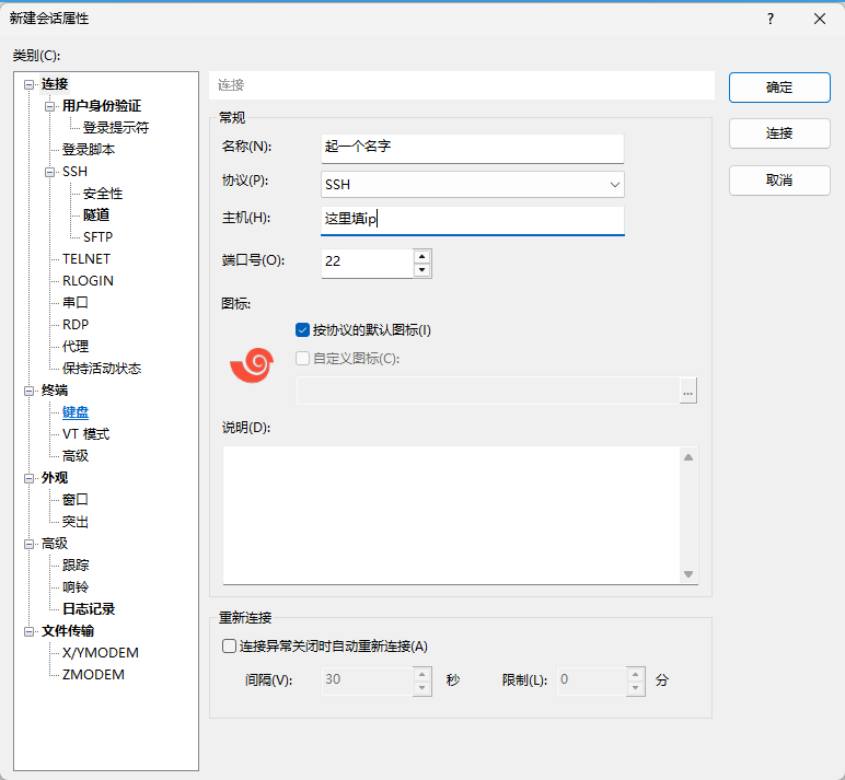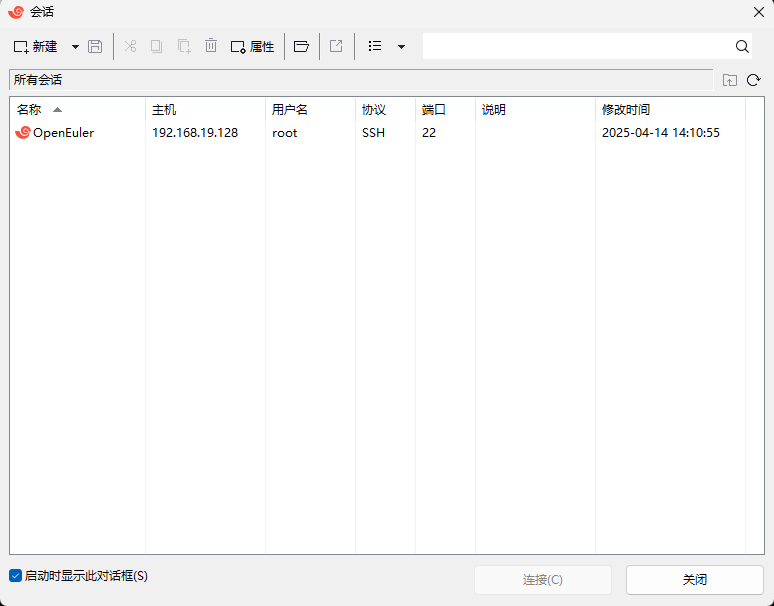 - 点击确定以保存,可以看到已经创建了相关会话,选中刚刚创建的会话,点击右下角连接以尝试连接