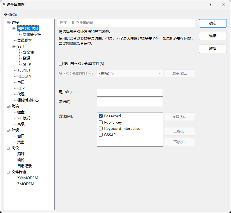 - 为避免每次链接都需要登陆,可以点击左边用户身份验证,填写用户名(注意是系统登陆的用户名不是xshell用户名)