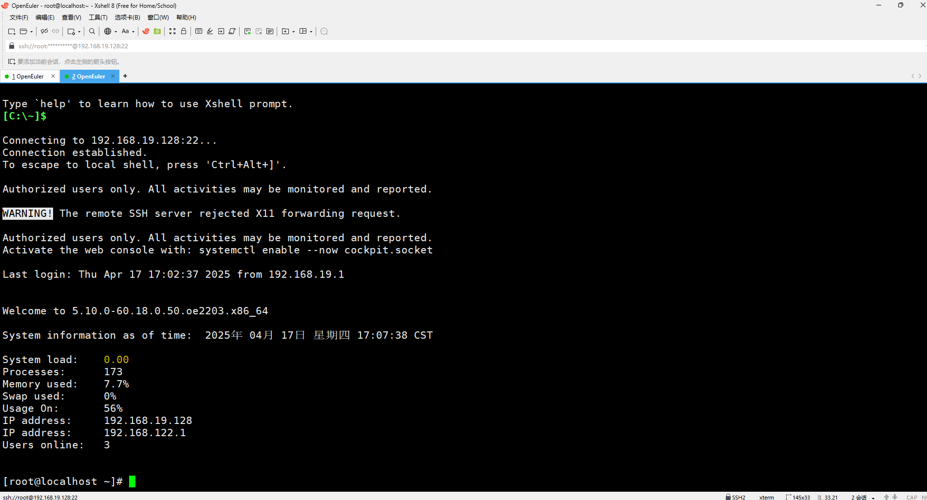 - 成功后如图,接下来就可以直接在xshell中对系统进行操作了