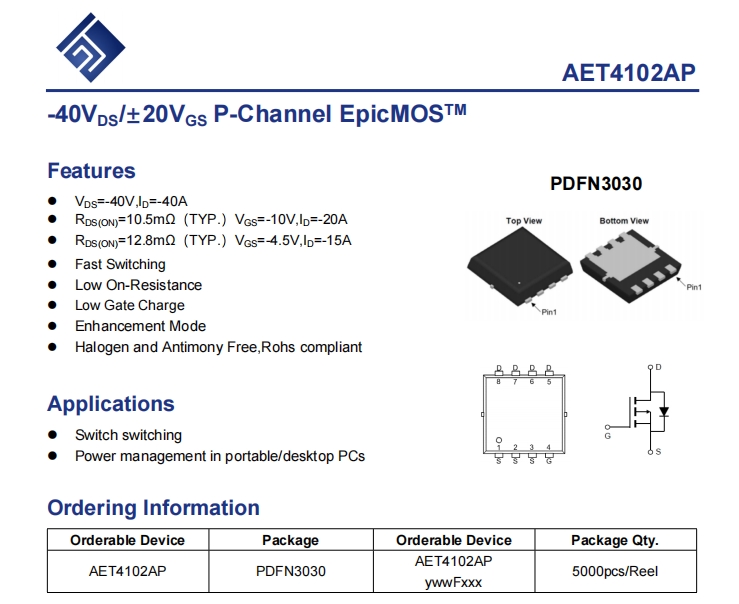 禾纳AET4102规格书,P-通道EpicMOSTM,禾纳AET4102代理商