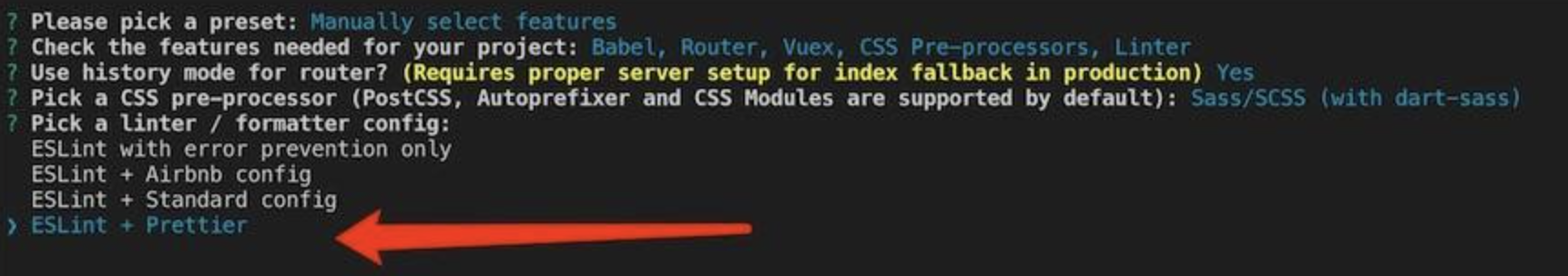 6.选择代码检测方式,这里新手建议选择最后一项目(ESlint +prettier),检测与格式化代码。按回车继续