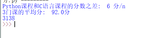 python=95english=92c=89sub=python-cavg=(python+english+c)/3print("Python课程和C语言课程的分数之差: "+str(sub)+" 分/n")print("3门课的平均分: "+str(avg)+"分")print("3138")