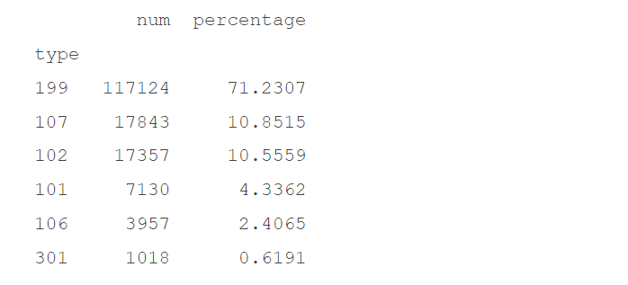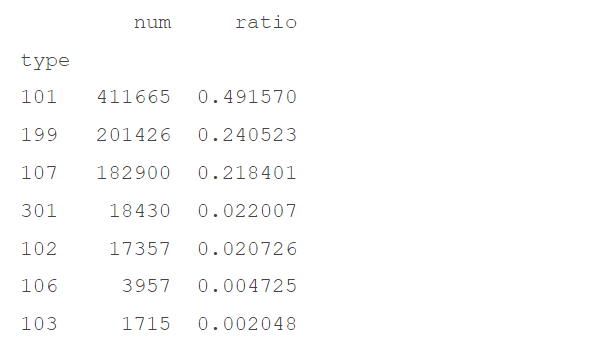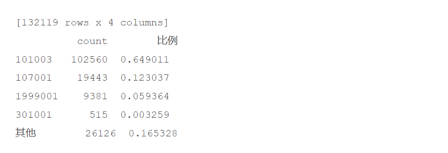 # 代码11-6 def xiaguang(i): #自定义统计函数 j = i.loc[(i['fullURL'].str.contains('\.html'))==False, ['fullURL','fullURLId','pageTitle']] return j # 注意获取一次sql对象就需要重新访问一下数据库 engine = create_engine('mysql+pymysql://root:123456@127.0.0.1:3306/test?charset=utf8') sql = pd.read_sql('all_gzdata', engine, chunksize = 10000)# 分块读取数据库信息 counts5 = [xiaguang(i) for i in sql] counts5 = pd.concat(counts5) xg1 = counts5['fullURLId'].value_counts() print(xg1) # 求各个部分的占比 xg_ = pd.DataFrame(xg1) xg_.reset_index(inplace=True) xg_.columns= ['index', 'num'] xg_['perc'] = xg_['num']/xg_['num'].sum()*100 xg_.sort_values(by='num',ascending=False,inplace=True) xg_['type'] = xg_['index'].str.extract('(\d{3})') #提取前三个数字作为类别id xgs_ = xg_[['type', 'num']].groupby('type').sum() #按类别合并 xgs_.sort_values(by='num', ascending=False,inplace=True) #降序排列 xgs_['percentage'] = xgs_['num']/xgs_['num'].sum()*100 print(xgs_.round(4))